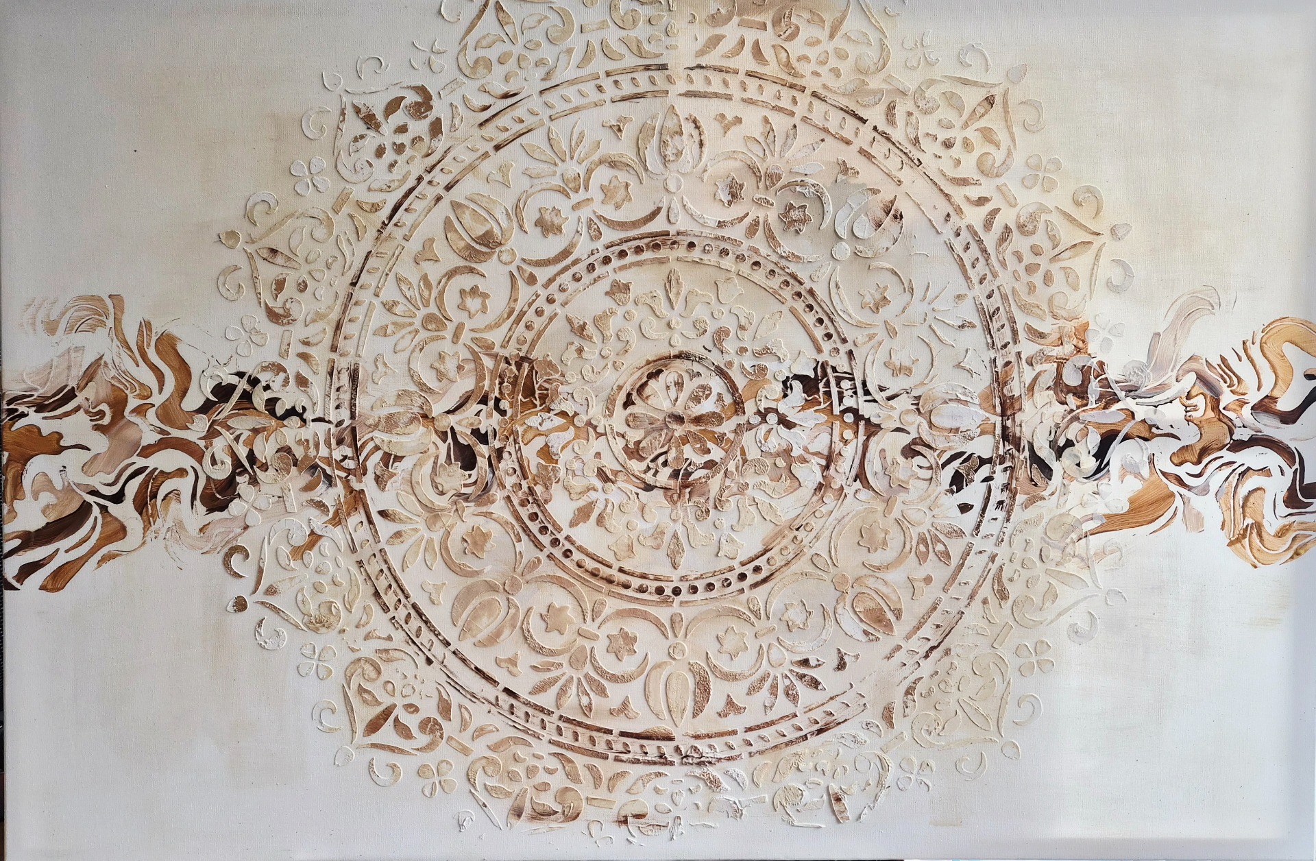 Vrstvení a jemné, na východě inspirované ornamenty se spojují do organických obrazových prostorů mezi harmonií a napětím.