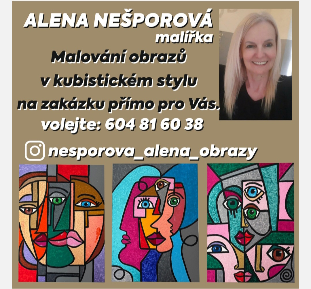 Jmenuji se Alena Nešporová. Pracuji jako odborný fyzioterapeut ve městě Znojmě. Jsem malířka obrazů v kubistickém stylu, který mě zcela uchvátil. Snažím se zachytit jedinečné příběhy ukryté v každém okamžiku života. Můj styl je plný dynamiky a odvážné barevné kompozice. Věřím, že moje tvorba Vás osloví stejně tak, jako mě samotnou fascinuje proces jejího vzniku.