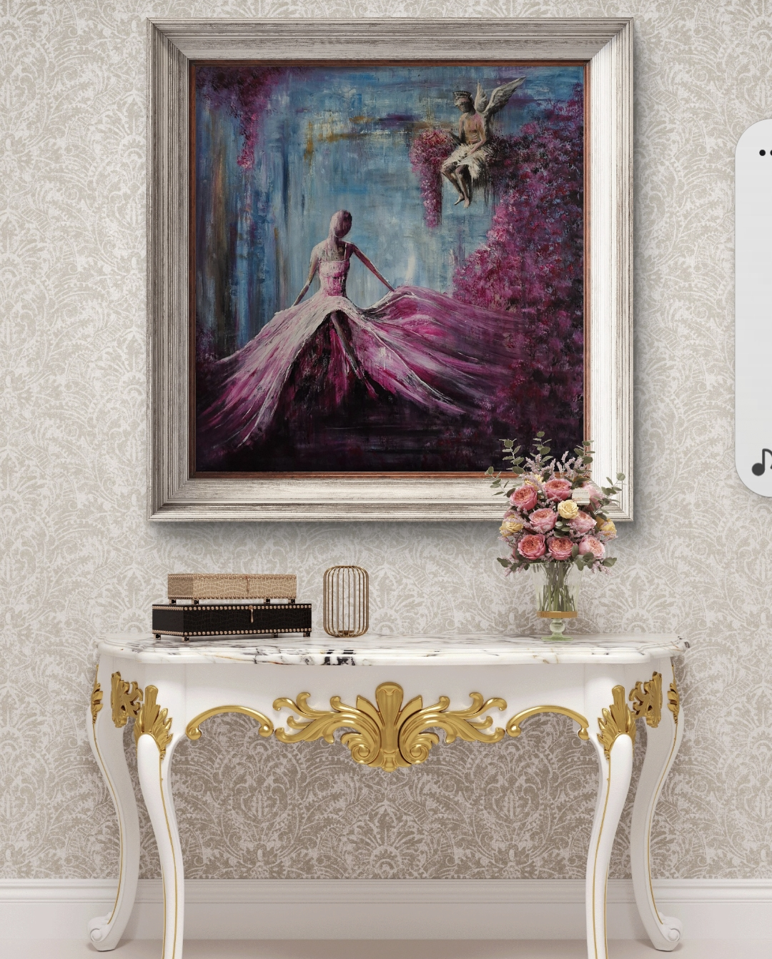 Obraz zachycuje éterickou ženskou postavu v bohatých růžových šatech, která působí zranitelně a zasněně uprostřed snového prostoru. Nad ní sedí drobná andělská bytost, jako neviditelný ochránce dohlížející z výšky mezi květy a světlem. Celá scéna vyzařuje jemnost a uklidňující naději, jako připomínku, že někdy nad námi skutečně bdí tichý strážný anděl.