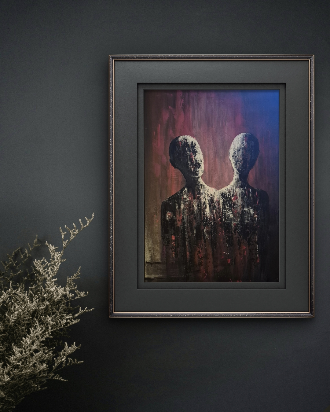 Obraz ukazuje dvě beztvářné postavy stojící těsně u sebe v temném, neklidném prostoru. Drsné tahy a rudé tóny vytvářejí napětí, jako by mezi nimi probíhal tichý, nevyřčený dialog. Celá scéna působí intimně, ale zároveň znepokojivě, jako naslouchání beze slov.